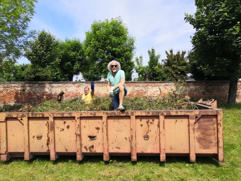 Zemědělské družstvo Kylešovice nám poskytlo kontejner, do kterého se podařilo dostat nejméně polovinu celkového objemu - zejména díky obratné šlapací technice Aharona Tesaře. Ještě jeden kontejner a na hřbitově bude zase čisto!